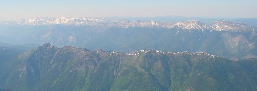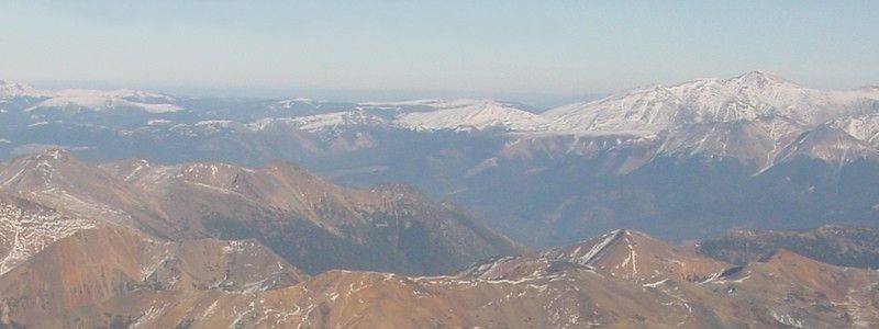 | The panorama above is wider than even a 1024 resolution screen will handle, but it's got so much detail on its edges I didn't have the heart to break it up; it's a zoom-in on the 097 shot above in the Big Dog Mountain section, and is looking straight down the strike of the Shulaps Range. Big Sheep and Big Dog Mountains are in the foreground, with Shulaps Peak and Rexmount hidden in the massif just right of centre - Rex would be the pointiest peak at the left-rear of the massif, I think, although that might be Shulaps Peak looking along the length of its spine, which appears trapezoidal in the pictures above. The snowy lower crag at left is (I think) Yalakom Mountain, above Moha, the snowy bit to the left of it is Camelsfoot Peak down nearer Applespring. The hazy low range in between Yalakom Mountain and the Shulaps is Fountain Ridge, the Chipuin Mtn area of the Clear Range to the left of it and behind Camelsfoot Peak amd Yalakom Mountain. Mt. Brew is just visible beyond the central massif of the Shulaps, and to the right of the massif in the background is the Cayoosh Range. The "near background" range at extreme right is the Bendor Range, with the low summits in the hazy mid-foreground being the lower "foothills" of Rex Peak visible in the Rexmount section above. This picture was taken on November 2, 2002, so the full blast of winter's not yet on the Shulaps or its neighbours; still, the snow doesn't get much deeper than shown here due to the incredible aridity of the winds after they've comeover the ranges between here and the Coast; the Camelsfoot Range and this northernmost part of the Shulaps doesn't often get much snow at all, despite incredibly bitter subarctic cold at these altitudes in the Interior. | |